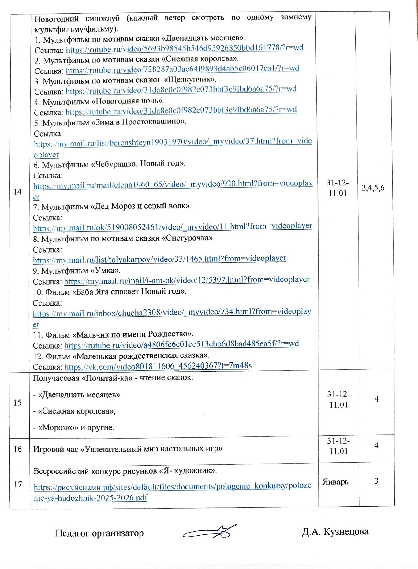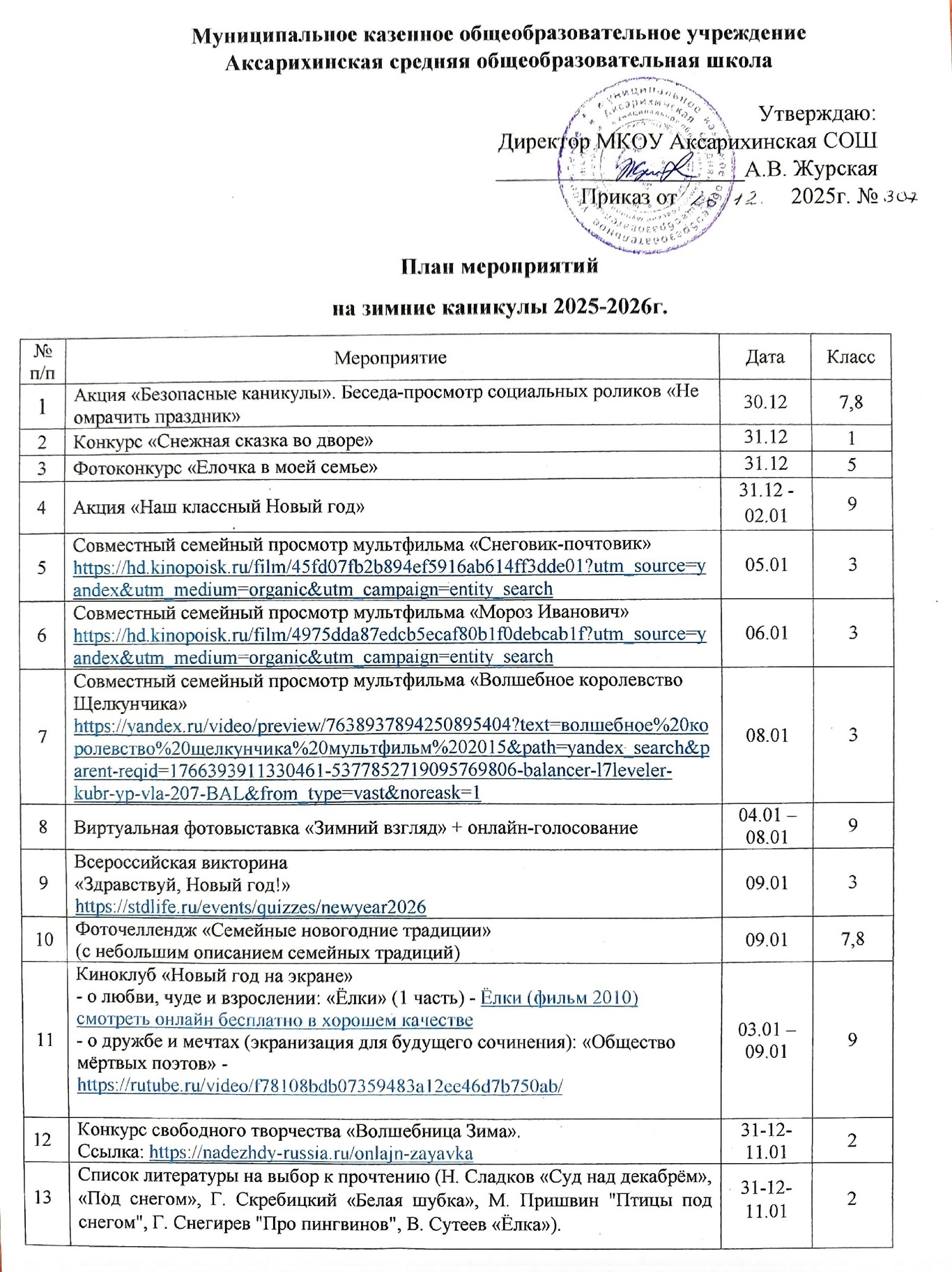 План мероприятий на зимние каникулы в МКОУ Аксарихинская СОШ 2025-2026 уч.г. 26 Декабрь 2025 740 просмотров ~5 мин 8 Нравится Поделиться Поделиться: