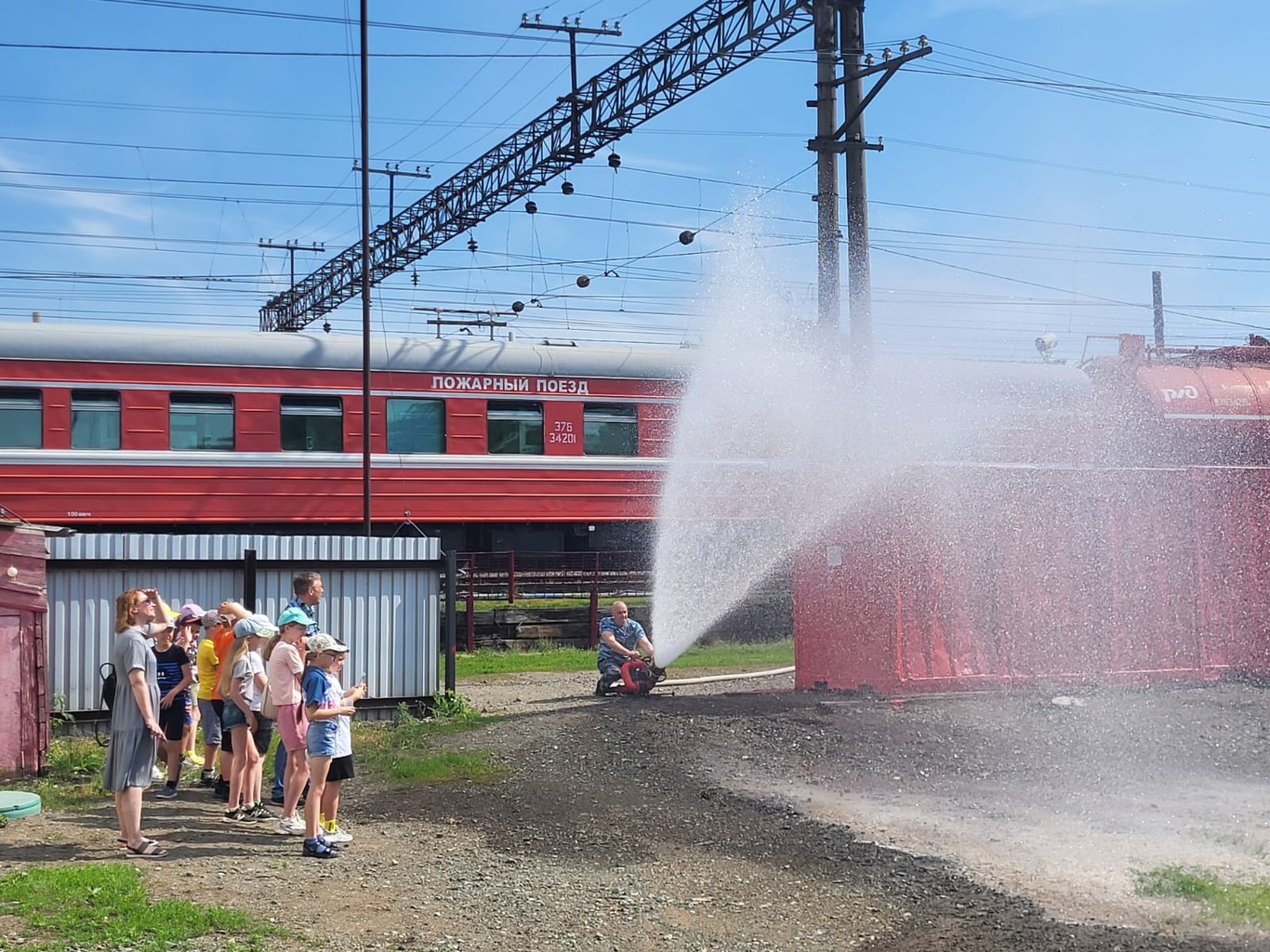 Начальник пожарного поезда станции Камышлов провел ребят по поезду. Рассказал и показал как все устроенно и работает. Ребята узнали о всех его деталях, особенностях и назначении каждого инструмента.