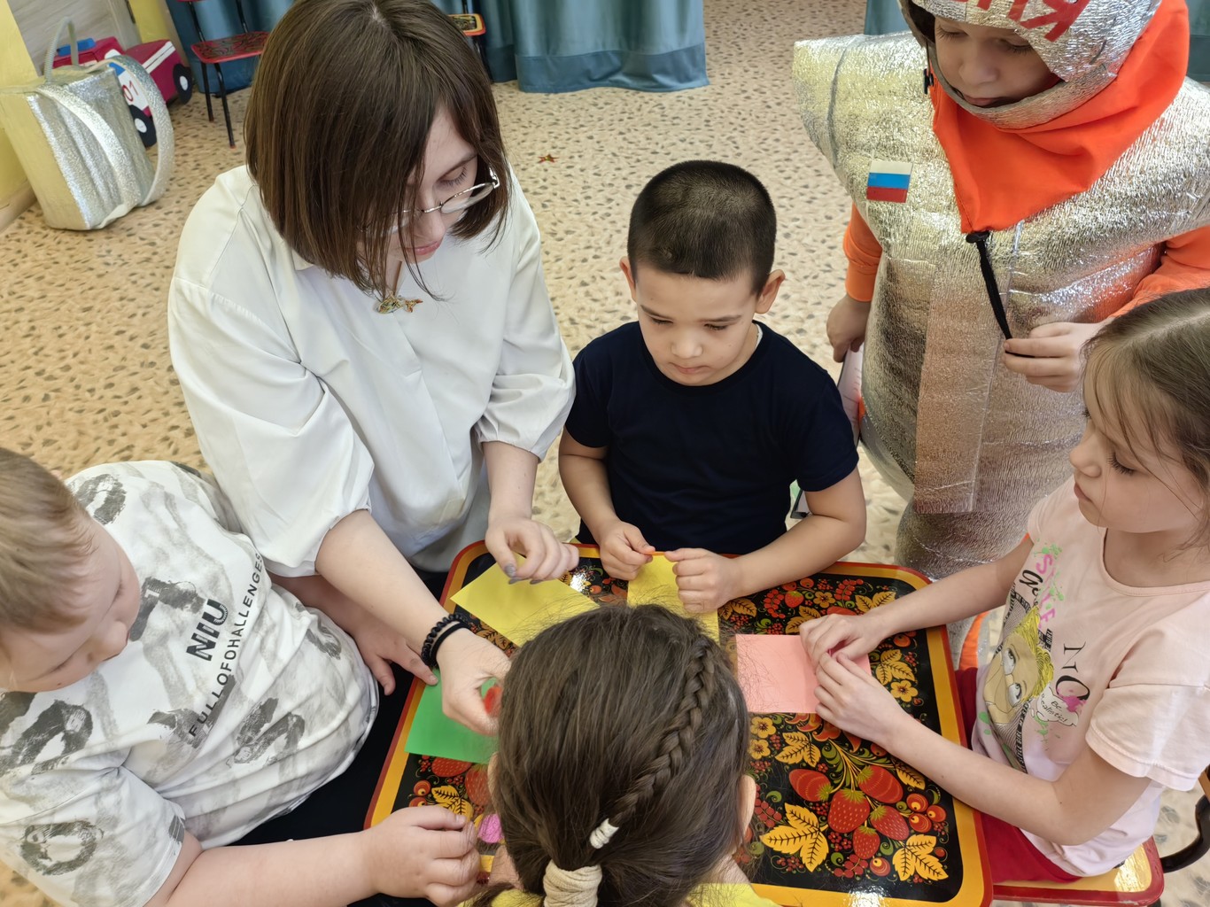 📅 Пятница: Заключительный день нашей весенней недели добра был посвящен самым маленьким членам нашего сообщества — малышам. В рамках социального партнерства с МКДОУ Аксарихинский детский сад, ребята из ученического совета, а именно Веретнов Дмитрий, Кайгородова Полина, Емельянова Виолетта, Яковлева София и Глухих Максим под руководством советника директора по воспитанию и взаимодействию с детскими общественными объединениями Кузнецовой Д.А. в преддверии Дня Космонавтики провели увлекательное мероприятие под названием "Путешествие в космос". В этот день детские глаза светились от восторга, а смех и радость заполнили каждую комнату. Мы играли с ребятами, погружая их в мир звезд и планет, и провели захватывающий мастер-класс по созданию ракеты. Каждый из малышей с увлечением создавал свою космическую мечту, а в воздухе витала атмосфера творчества и дружбы. Это было не только интересно, но и познавательно, ведь мы вместе открывали для них безграничные горизонты воображения!