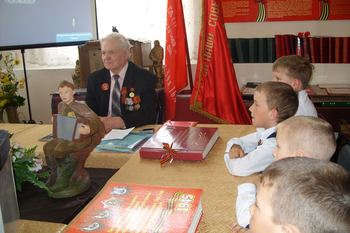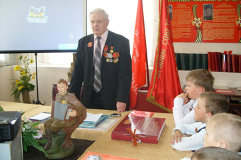 8 мая 2019 года первоклассники, а также юнармейцы 7 класса посетили Камышловский краеведческий музей, где состоялась встреча с Матвеевым Валентином Ивановичем, куратором 313-й стрелковой дивизии в Свердловской области. Валентин Иванович рассказал ребятам почему увлёкся поисковой деятельностью. Оказывается всю свою жизнь он считал своим святым долгом найти место гибели и захоронения своего отца, приехать на это святое место, возложить цветы, поставить поминальную свечку, поклониться отцу. Мечту свою осуществил. Как это произошло и услышали наши ребята из уст Валентина Ивановича. В память о встрече, ветеран подарил для музея школы две книги, автором которых является он сам, которые посвятил светлой памяти погибшим.