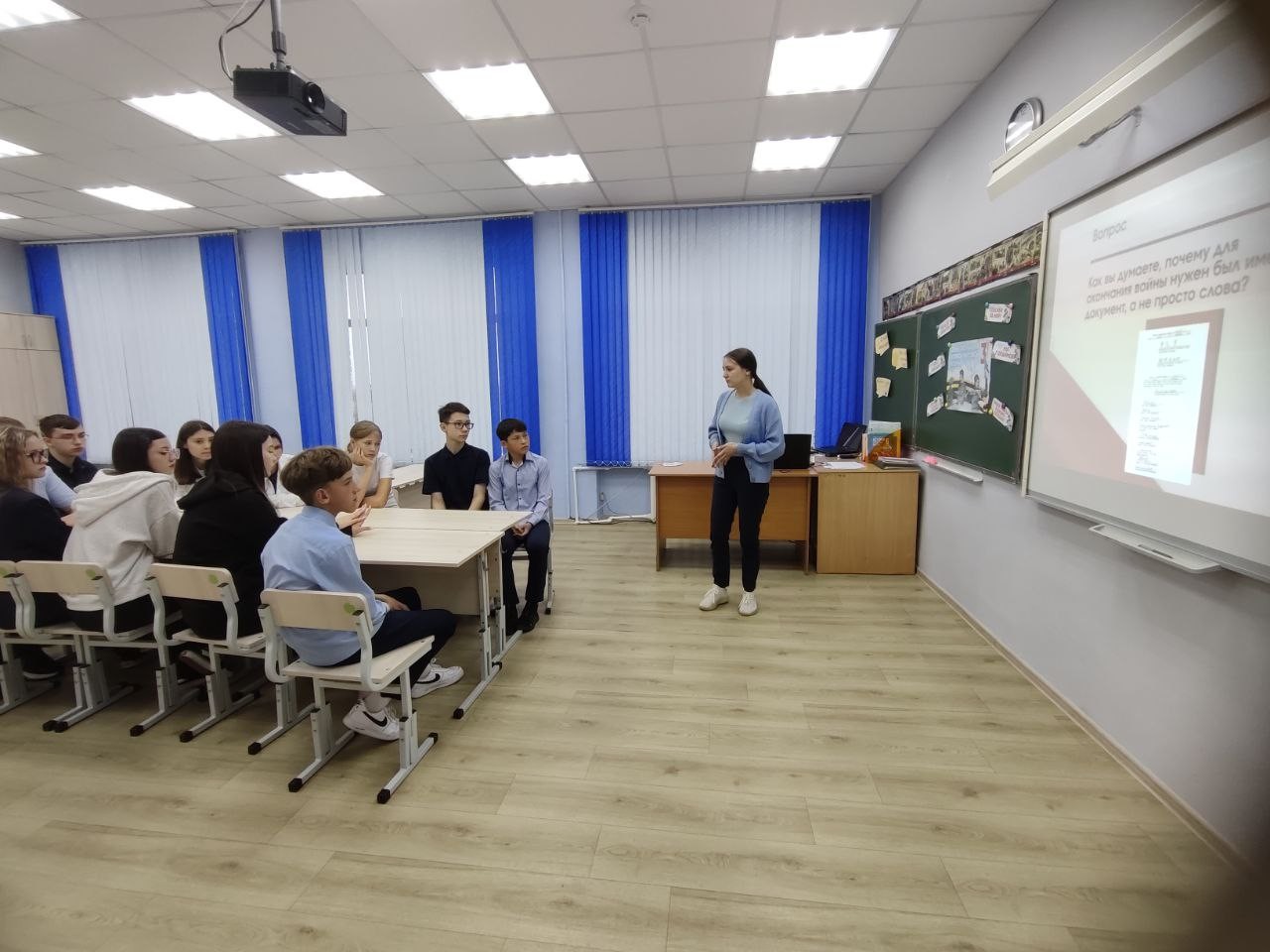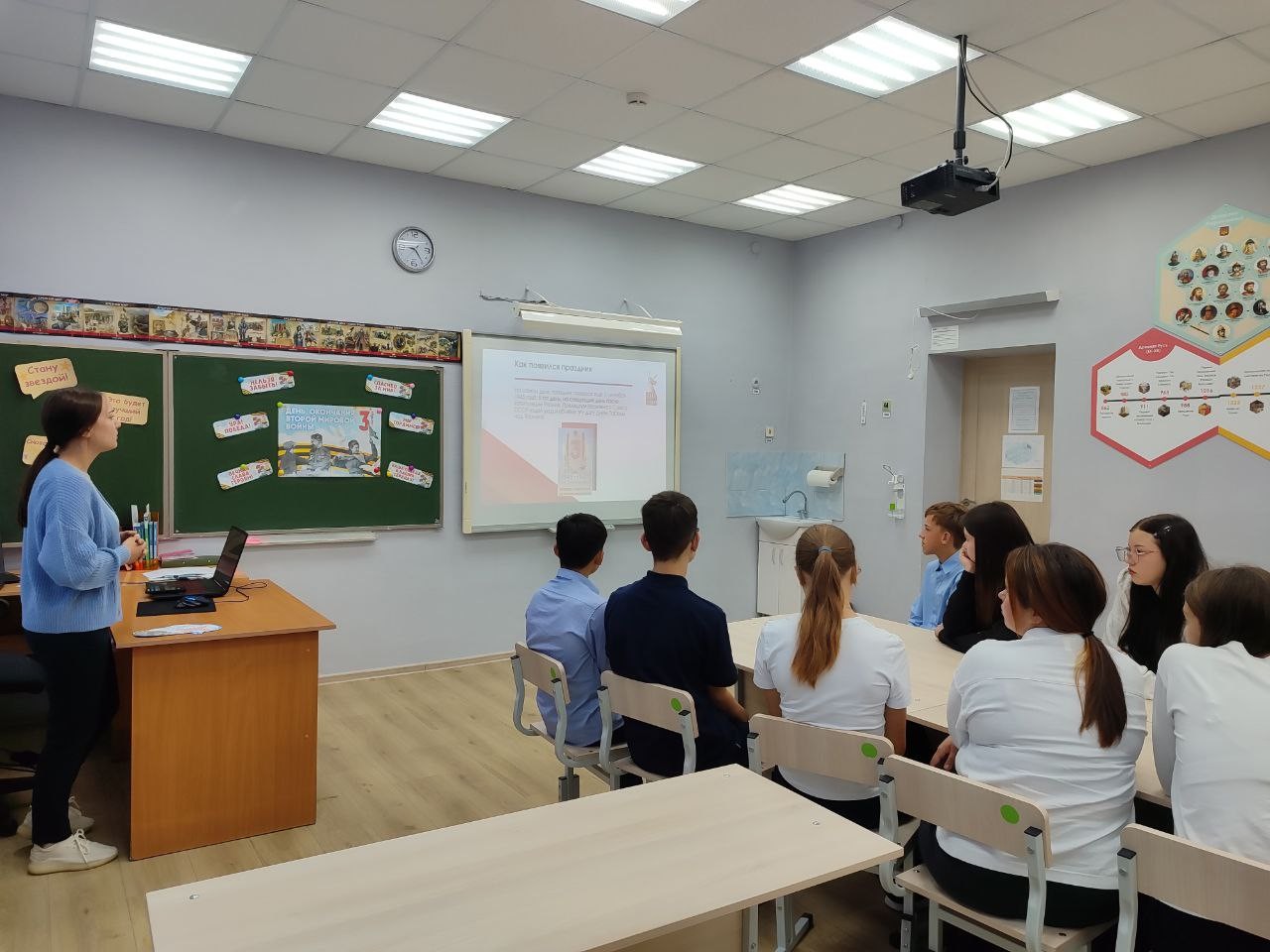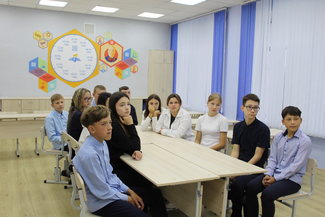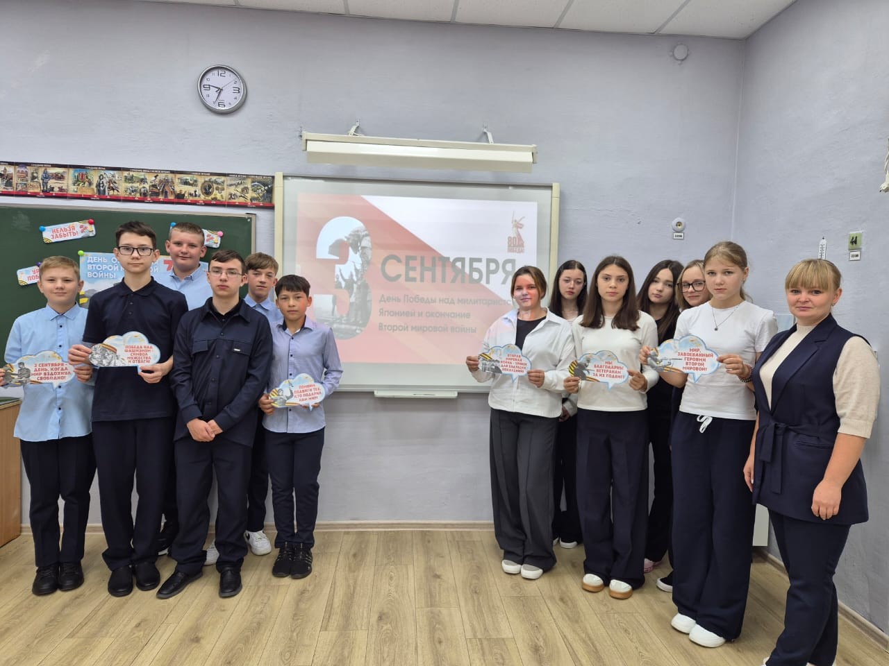 В этот день, посвященный Победе над милитаристской Японией и окончанию Второй мировой войны, обучающиеся 8 класса, вместе с учителем истории, Сираевой Ангелиной Марсовной, и, советником директора по воспитанию и взаимодействию с детскими общественными объединениями Кузнецовой Дарьей Александровной, провели круглый стол под названием «Подвиг народа».