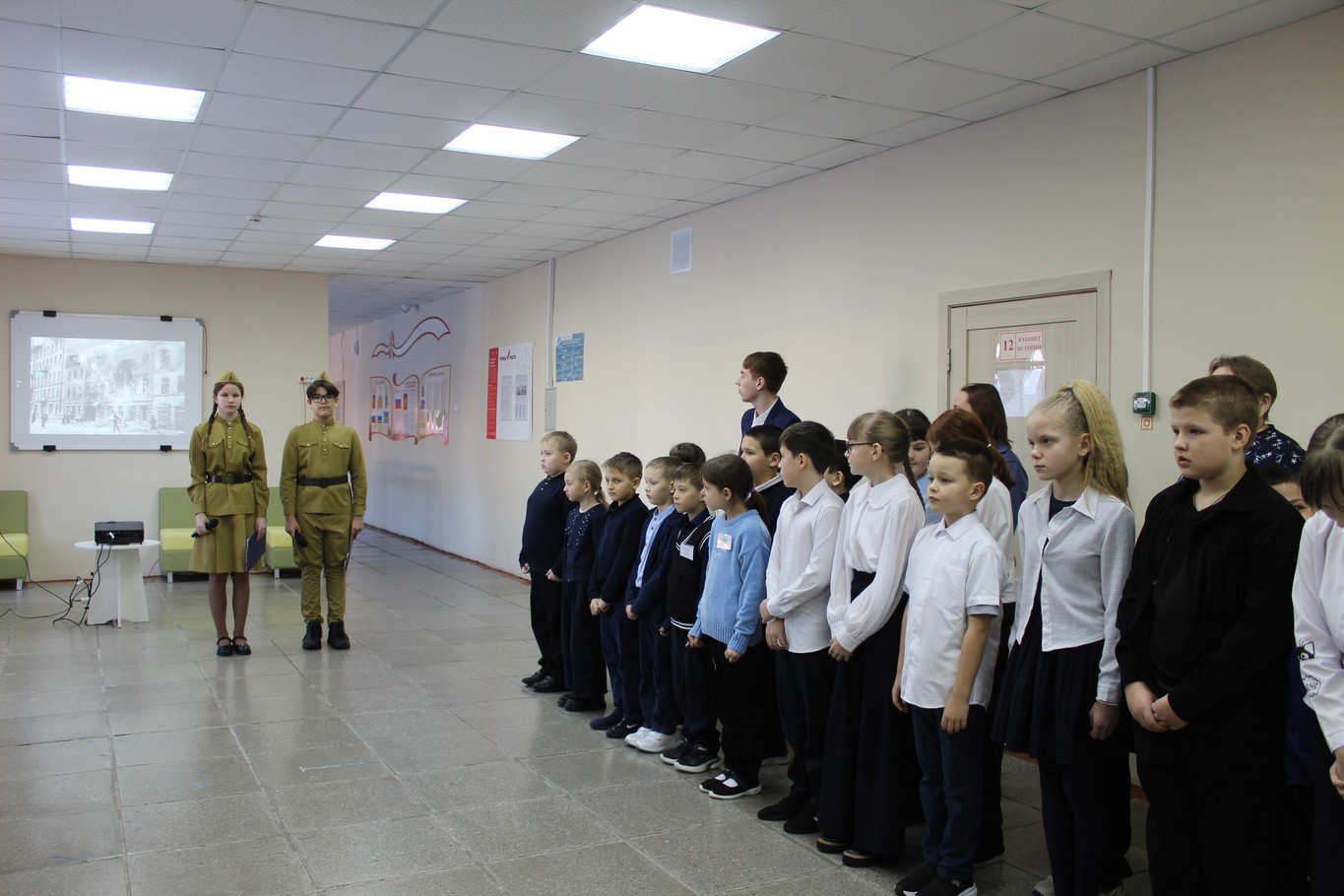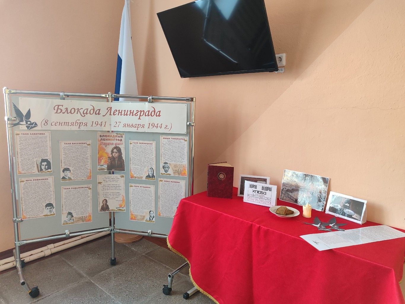 В холле первого этажа школьным библиотекарем Сарычевой Надеждой Ивановной и советником директора по воспитанию Кузнецовой Дарьей Александровной была подготовлена тематическая выставка «Ленинград глазами детей». Воспоминания детей из дневников – всё это живое свидетельство тех страшных лет, увиденных детскими глазами. Выставка позволила ребятам еще глубже прочувствовать трагедию блокады, понять, как дети, лишенные детства, продолжали верить в победу и помогали взрослым.